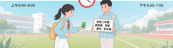 在校园内活动时,避开伊蚊活动高峰(上午6~8点、下午5~7点),出门使用驱避剂,着浅色长衣长裤。