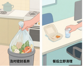 1.及时清理生活垃圾,如垃圾袋、一次性餐盒、水杯等;