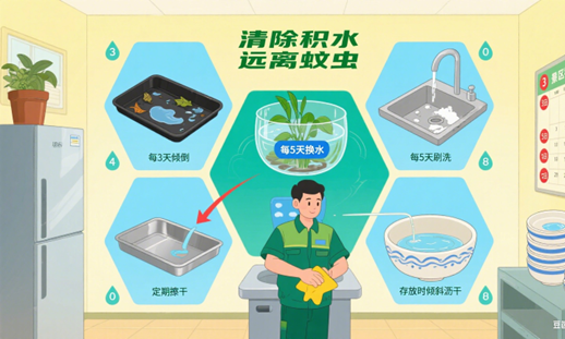 5.清理室内容器积水,如花盆托盘、饮水机水槽、冰箱托盘、各种厨具和餐具、水生植物等,应每3~5天清理或换水;